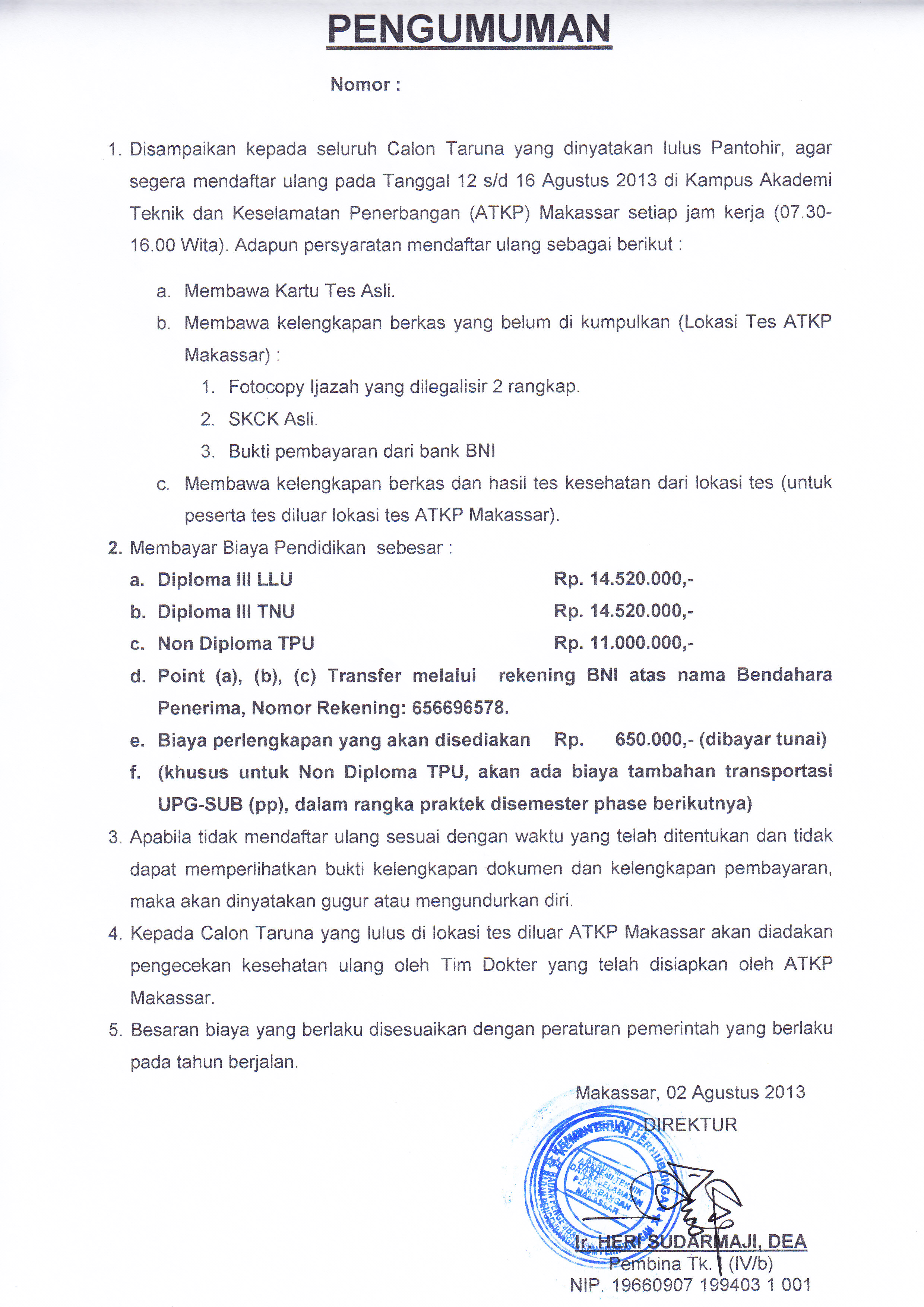 Disampaikan Kepada CATAR ATKP MAKASSAR Tahun 2013/2014, berikut adalah nama catar yang lulus sebanyak 62 Orang: