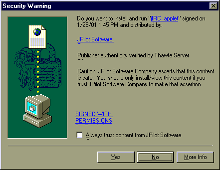 Program adalah java Applet yang akan mengkoneksikan anda dengan server IRC anda misalnya "irc.dal.net" atau server lainnya, anda tinggal configurasi saja. Jika pada saat anda menjalankan program ini dan muncul window seperti ini : SECURITY WARNING : do you want to install and run"jIRC applet .......